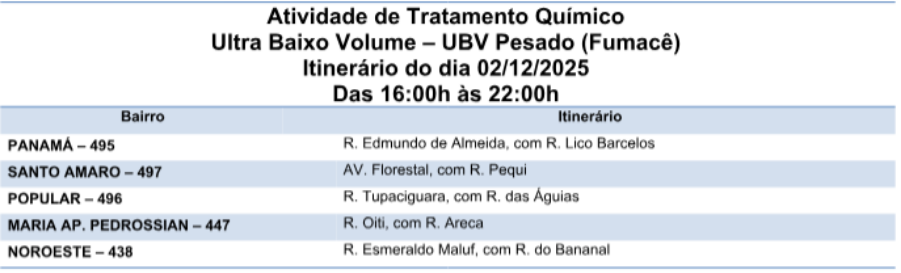O fumacê visa conter a proliferação do mosquito Aedes aegypti, que também transmite zika e chikungunya. Conforme a CCEV (Coordenadoria de Controle de Endemias Vetoriais), das 16h às 22h, as equipes intensificam a desinfecção nos bairros: Jardim Panamá, Santo Amaro, Vila Popular, Maria Aparecida Pedrossian e Jardim Noroeste.