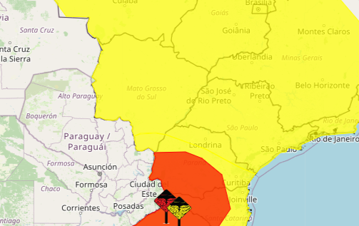 Na região sul, 13 cidades estão sob alerta de tempestade, com risco de corte de energia elétrica, danos em plantações, queda de galhos de árvores e alagamentos. Pode chover até 50 milímetros entre 12h desta segunda-feira e 23h59 de terça-feira.